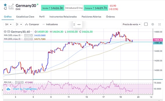 كما سجل مؤشر Germany30 أيضاً بعض الخسائر، حيث يتم تداوله في مناطق الدعم بين خطوط المتوسط المتحرك البسيط لـ 100 و200 ساعة، حول منطقة الدعم 14583. و أدنى هذه المستويات، سينخفض إلى منطقة 14450.