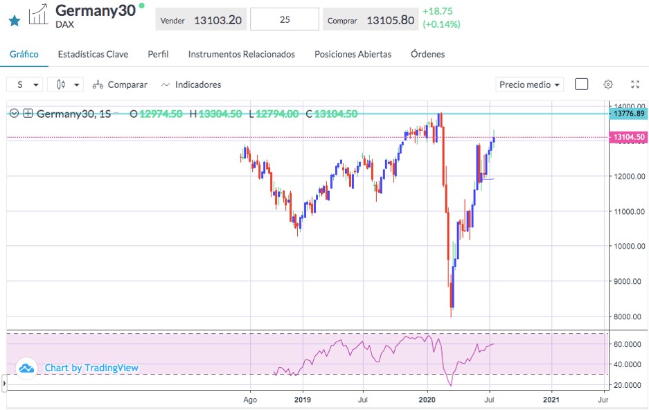 However, Germany30 is also in a clear upward trend heading towards the high levels seen before the crisis in the area of 13,700.
